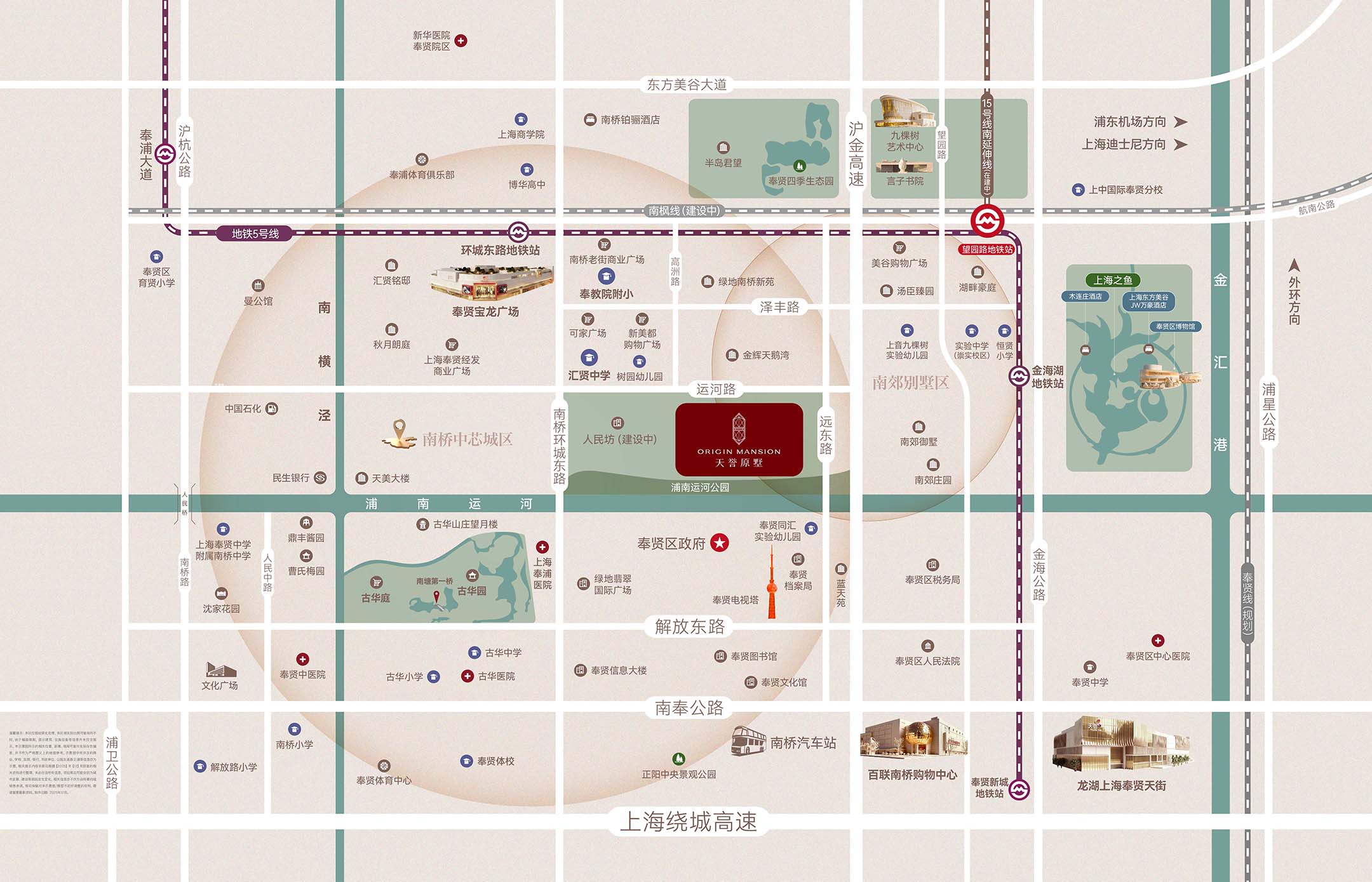 【交通配套】:项目拥享三轨交汇的便捷交通,地铁5号线、在建的15号线延伸段、南枫线。三轨交汇,便捷出行。【商业配套】:近享约25万方综合体金鱼广场(在建)、商业文化综合体在水一方(在建)以及龙湖天街、百联、苏宁、传悦坊、宝龙广场等大型商业综合体,满足运动健康、潮流购物、美食娱乐、亲子活动等需求,赋予国际生活零时差。【教育配套】:距项目直线距离约2公里范围内有上海市奉贤区华亭学校,汇贤中学,奉教院附小,奉贤区实验中学(崇实校区),古华中学,古华小学等[仅列举项目周边学校名称,不作对口承诺,学区划分最终以教育局公布为准」。【医疗配套】:项目周边有上海交通大学附属第六人民医院南院(奉贤中心医院)、国妇婴奉贤院区(三甲)、在建中的复旦大学附属儿童医院(三甲)、在建中的新华医院(三甲),为业主全家人的健康保驾护航。